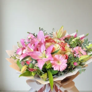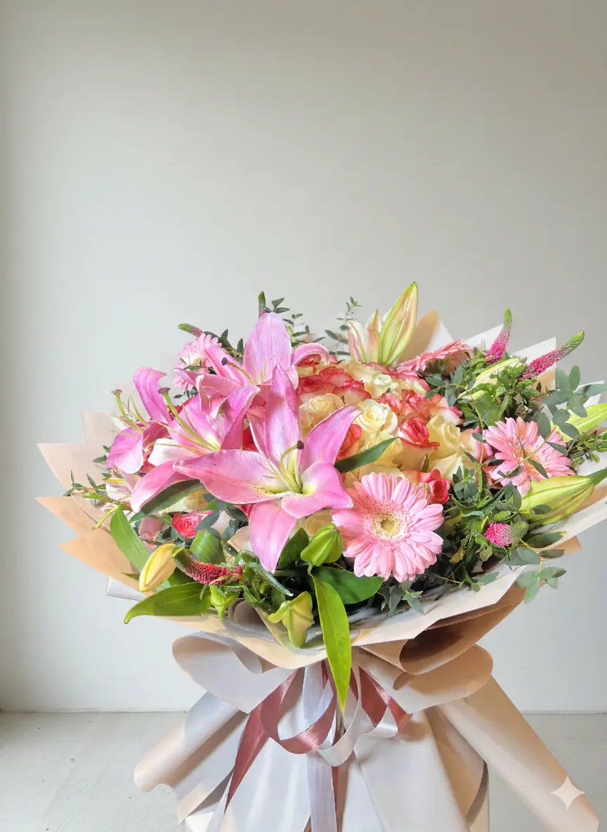 باقة ناعمة بتدرجات وردية من الزنابق والزهور الموسمية، تنبض بالأناقة وتضيف لمسة فرح مميزة. خيار مثالي لمعايدات العيد والهدايا التي تعبّر عن الحب والاهتمام