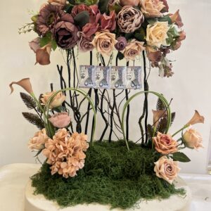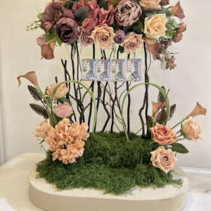 يُعد تنسيق “ستاند ورد ” تحفة فنية تجمع بين سحر الطبيعة وفخامة الإهداء. صُمم هذا الستاند بأسلوب الحديقة المعلقة، حيث ترتكز قبة من الزهور الفاخرة على أغصان طبيعية بارزة، تتوسطها مساحة مخصصة لعرض الهدايا النقدية بطريقة أنيقة وجذابة. يستقر التصميم على قاعدة من العشب الطبيعي (Moss) والزهور الأرضية، مما يجعله الخيار الأول والأنسب لمناسبات الأعياد، الزواج، أو هدايا “التمائم” الفاخرة.