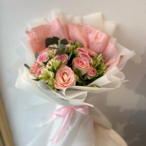 من زهور الألستروميريا الرقيقة لتشكل باقة متناغمة ومريحة للعين. ما يميز هذه الباقة هو دمج ورق التغليف الأبيض مع طبقة من الدانتيل الوردي الفاخر في الخلفية، مما يعطيها طابعاً كلاسيكياً ناعماً يشبه فساتين الأميرات، لتكون الهدية المثالية للتعبير عن المشاعر الرقيقة.